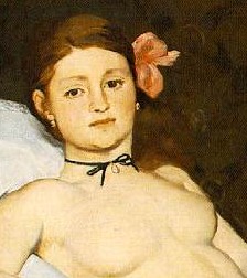 As its title suggests, this mixed media painting on paper (ink, gouache, watercolour crayon, wax crayon), developed from a Sony Reader drawing, references Manet’s Olympia, whose direct, impenetrable gaze continues to intrigue and fascinate. She is looking at us as much as we are looking at her. Her appropriation of the gaze causes equivalence between the subject and the object, the viewer and the viewed. And why “Green Olympia”: because of the colour, simply.